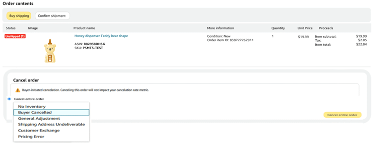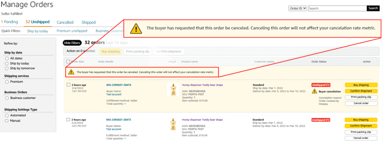如果买家在下单30分钟后请求取消,您可以在【管理订单】页面查看取消请求,该页面位于订单信息正上方,并带有一条横幅显示“【买家已请求取消此订单。取消此订单不会影响您的取消率指标】”。