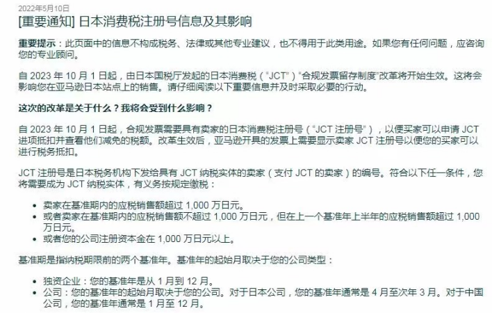 5月10日,亚马逊日本站的卖家后台都收到一则通知,日本消费税(JCT)“合规发票留存制度”改革将于2023年10月1日起生效。根据合规要求,日本卖家需要注册消费税号JCT,否则将无法开具发票,无法让买家申请JCT进项抵扣并查看他们减免的税额。