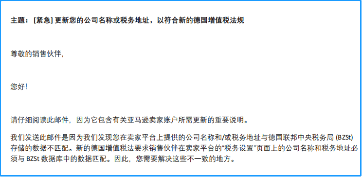 首先是税务合规方面,您需要符合德国增值税法规要求,除了确保VAT有效性之外。根据德国税局要求,您还需要确保您在卖家平台的地址和税局的一致性。最近,有很多德国站点的卖家,收到了亚马逊发出《[紧急]更新您的公司名称或税务地址,以符合新的德国增值税法规》的业绩通知,要求卖家对VAT证书上面的公司名称/地址与亚马逊卖家平台的信息保持一致。