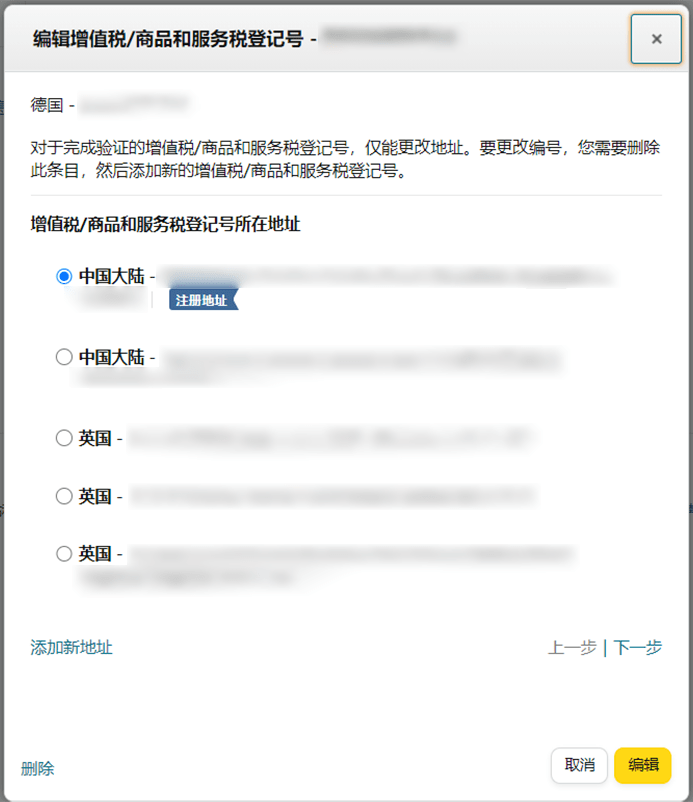 您可以联系相应的德国税务机关或您的税务代理以提供更新的信息。修改详细信息后,请附上税务机关的确认书,并通过de-vat-number-appeals@amazon.com提供相关证明文件(建议使用英文)。如果您的修改正在进行中,且暂时还未生效,您亦可以将目前的修改进度向亚马逊团队报备,避免影响您的账户状态。