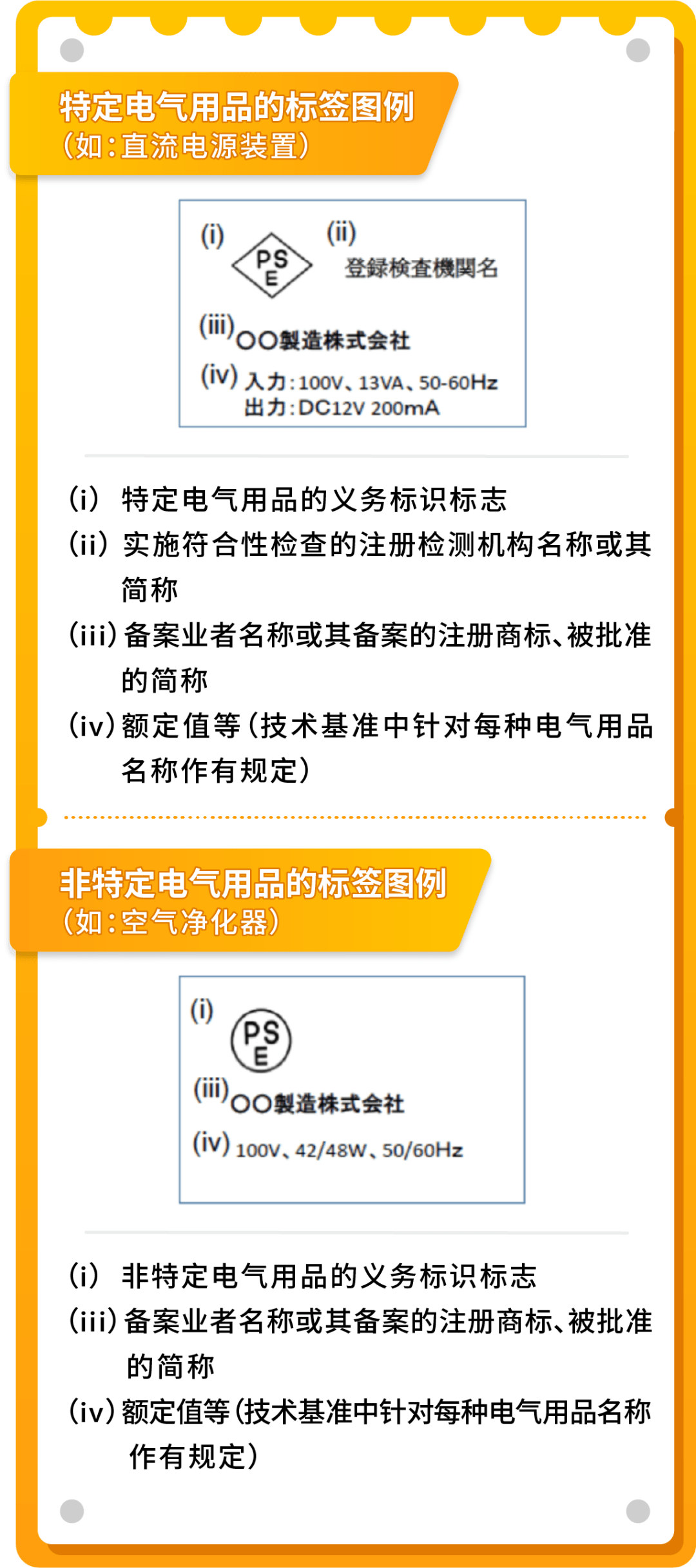 圆形PSE认证“非特定电气用品”产品则需要制造商和进口商事先通知日本经济产业省并经自我确认符合日本电气用品技术基准后,粘贴圆形PSE标志。