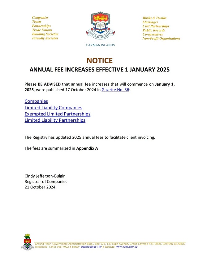 重要通知 | 开曼群岛公司、有限责任公司和合伙企业年费将于2025年1月1日起上调