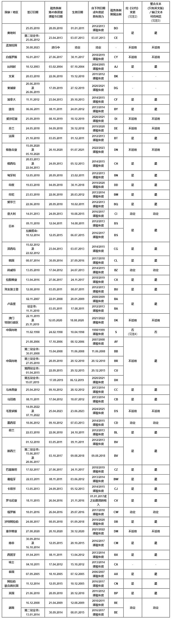 税收协定签订国家/地区