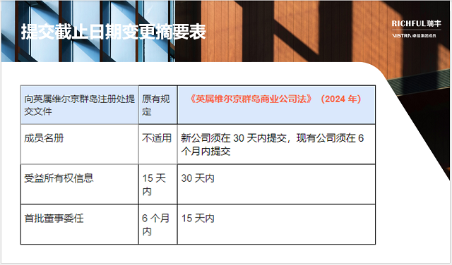 修订法规定,英属维尔京群岛商业公司必须维护并向英属维尔京群岛公司注册处(下称“注册处”)提交成员名册。现有公司须在修订法生效后六个月内完成提交。