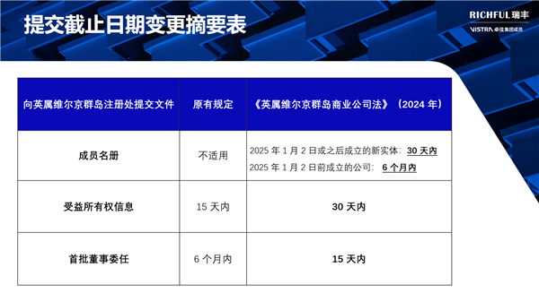 对于在BVI设有业务或计划在该地区设立公司的企业来说,了解并准备应对这些变化至关重要。为了确保顺利过渡到新法律框架,BVI的监管机构可能会提供详细的指导方针和实施细节。RICHFUL瑞丰目前正在密切关注相关更新,积极确定提交资料的相关流程细节,并将在接下来的几周和几个月内与您保持持续沟通,以便于您及时调整运营和合规策略,确保符合新法律的要求。