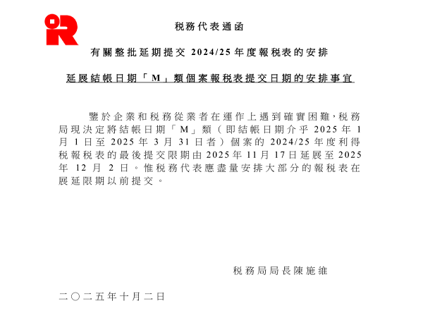 香港税务局于2025年10月2日发布最新通告,为缓解企业年底申报压力,正式延长结账日期「M」类公司(即财政年度结账日期在2025年1月1日至3月31日之间)的2024/25年度利得税申报期限——由原定的2025年11月17日延后两周至2025年12月2日。本次延期旨在为企业提供更多准备时间,但需注意12月2日为最终截止日,逾期将面临合规风险。