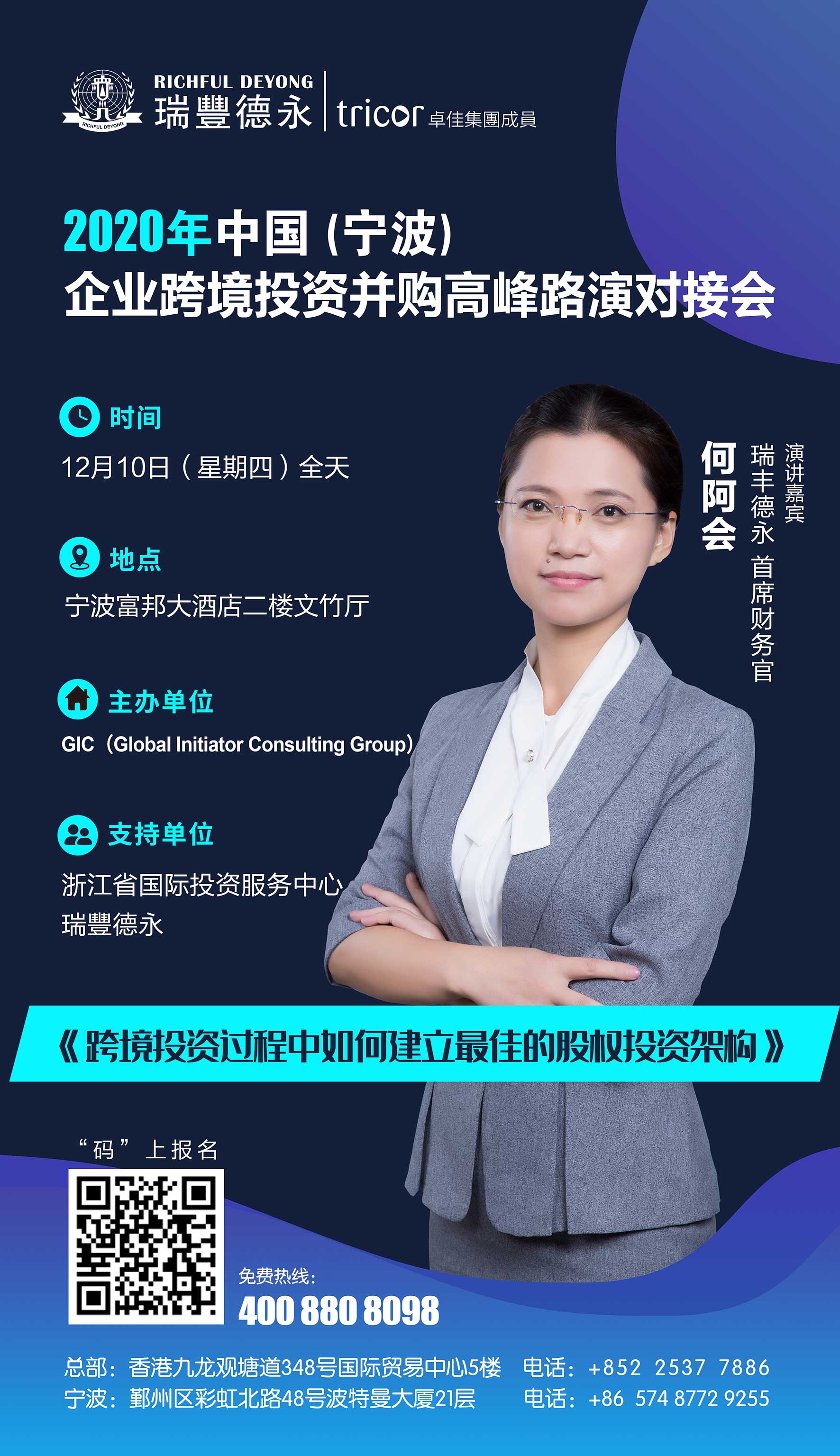 12月10日「2020年中国(宁波)企业跨境投资并购高峰路演对接会」将在宁波富邦大酒店举办。